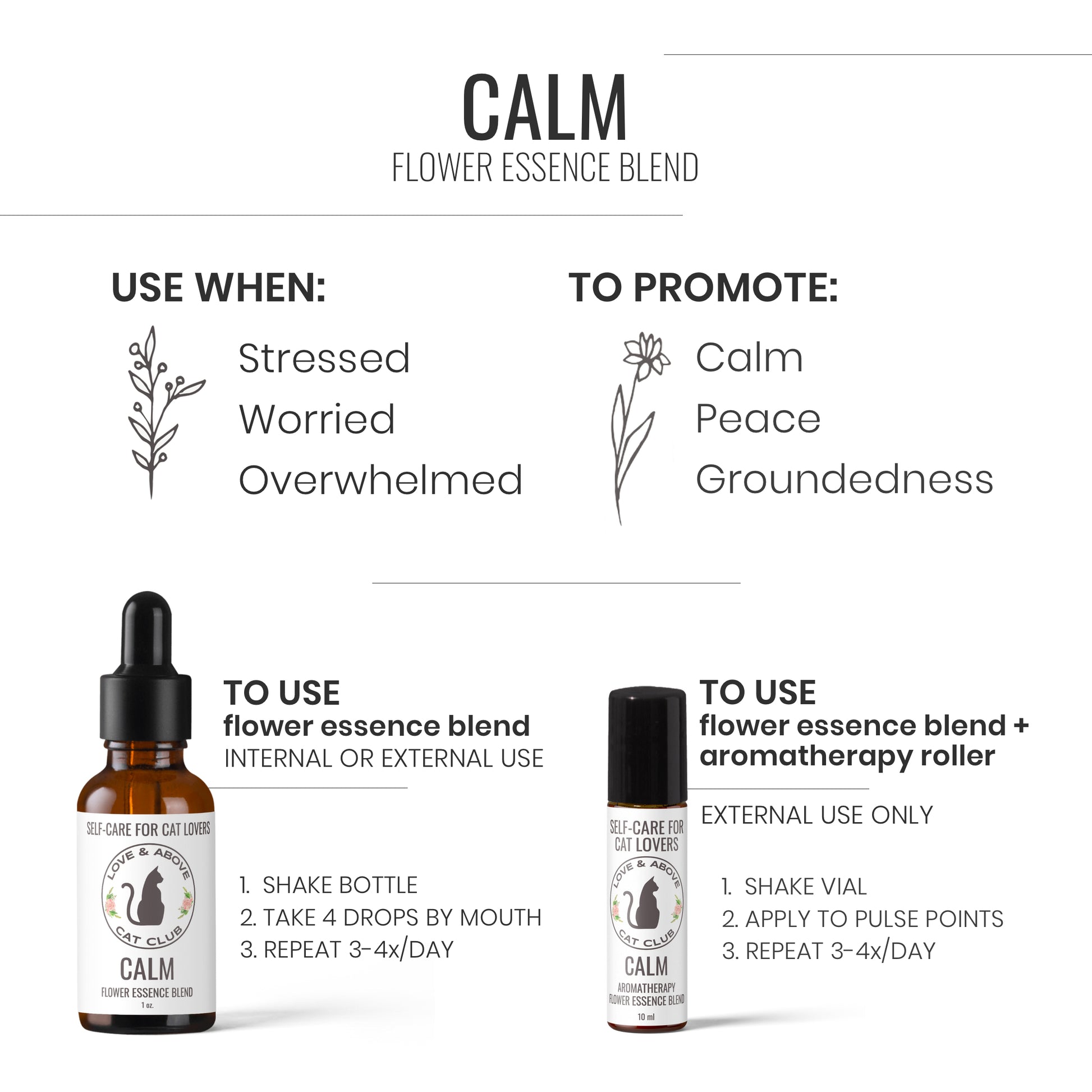 Calm is formulated to address stress, anxiety, and worry in humans. It supports peace and grounding. Our energy affects our cats. Holistic solutions can help us, and our animals. Use consistently over time for best intended results. eg: to prepare for a stressful event, begin using a week prior.