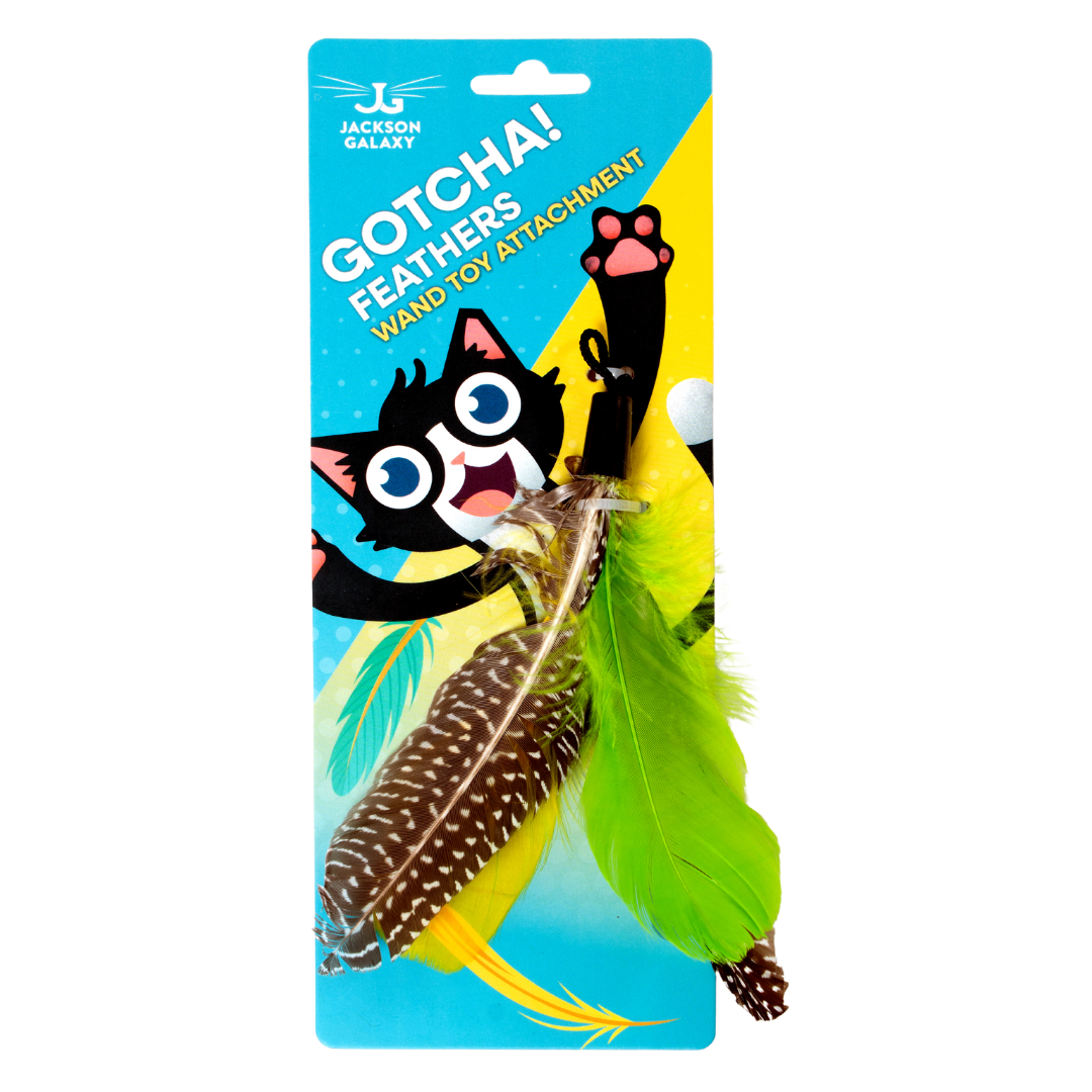 Has your Gotcha! Cat Wand Toy been hunted, caught, and killed one too many times? Give new life to your cat’s favorite toy with my Gotcha! Feather Wand Attachment. Simply unclip the worn out and chewed up feathers and replace. Keep a few of these on hand to make sure there are no interruptions to your cat’s daily playtime!
