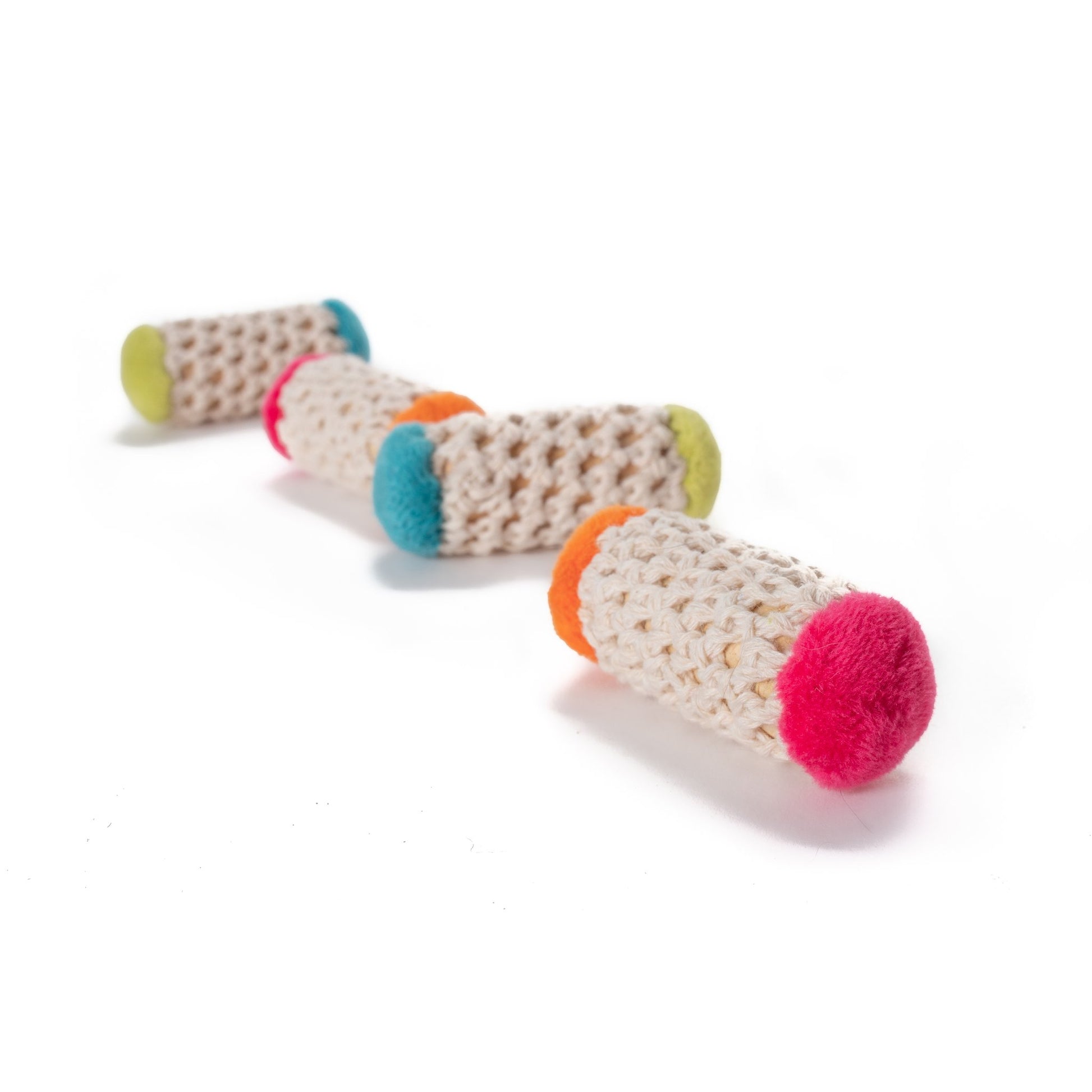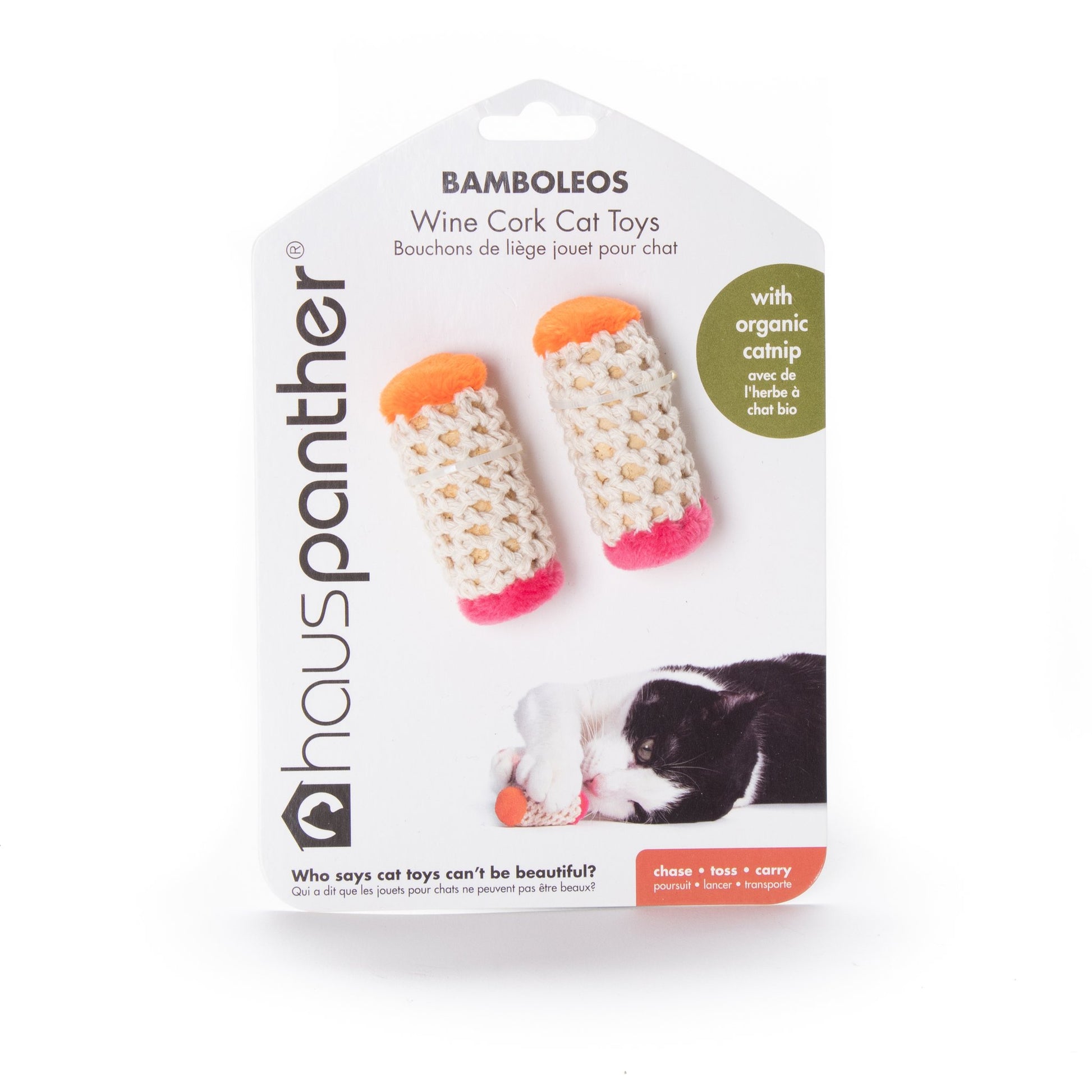 Made with wine corks inside, these toys bounce around unpredictably, great for casing, tossing and carrying. A touch of organic catnip makes them extra enticing! Made with unique materials cats love and that look great in your home. Who says cat toys can’t be beautiful?