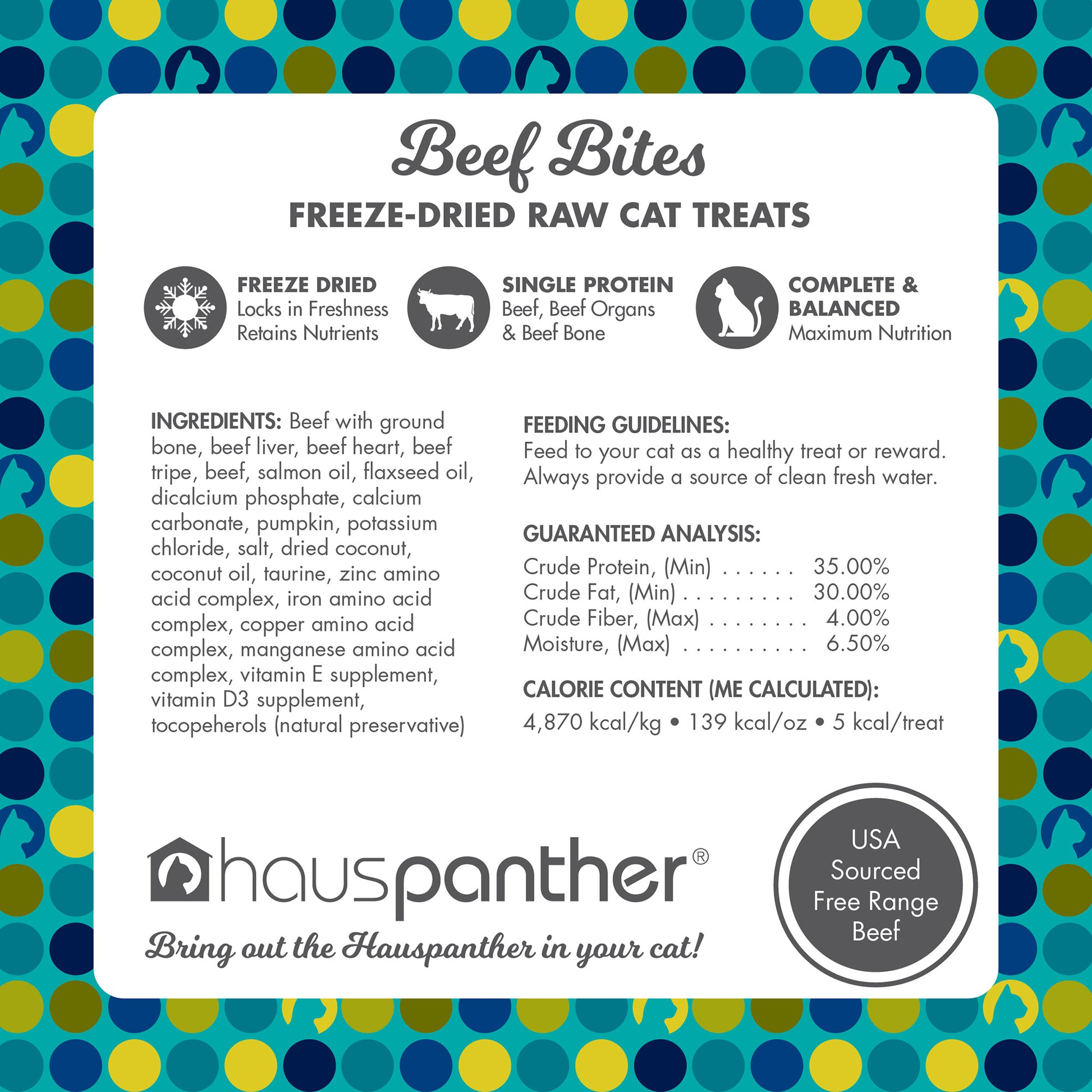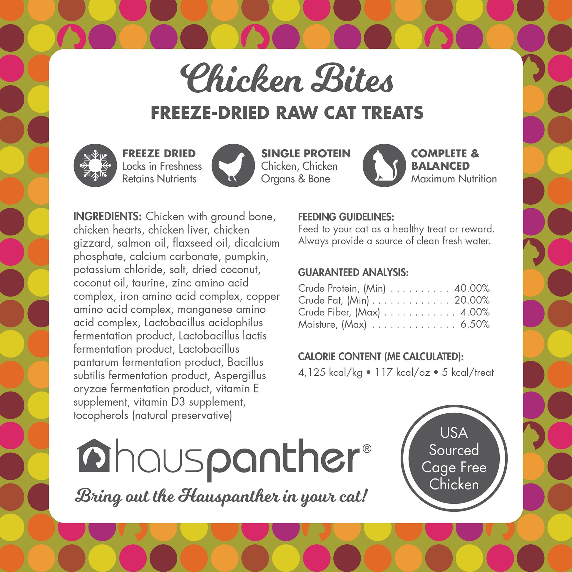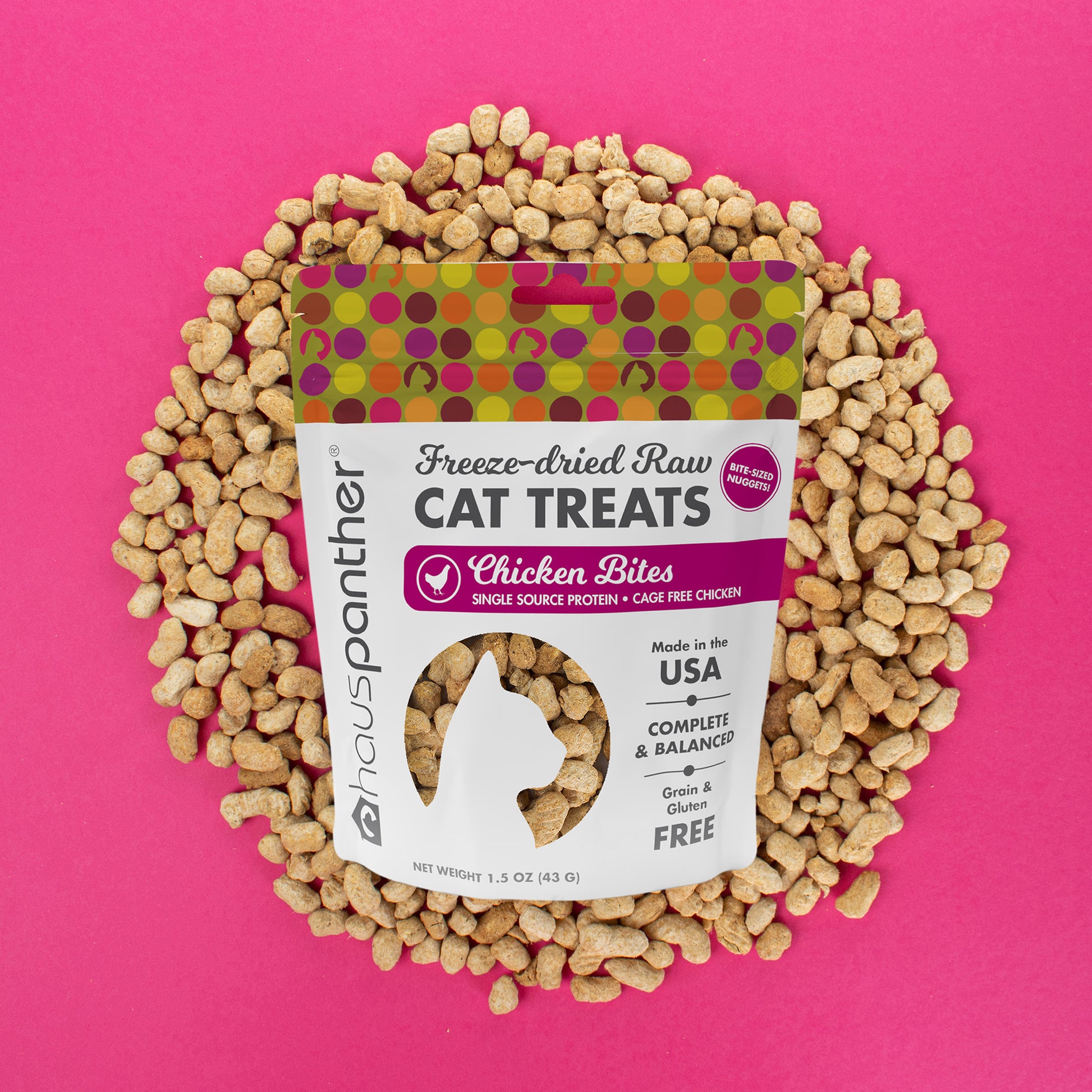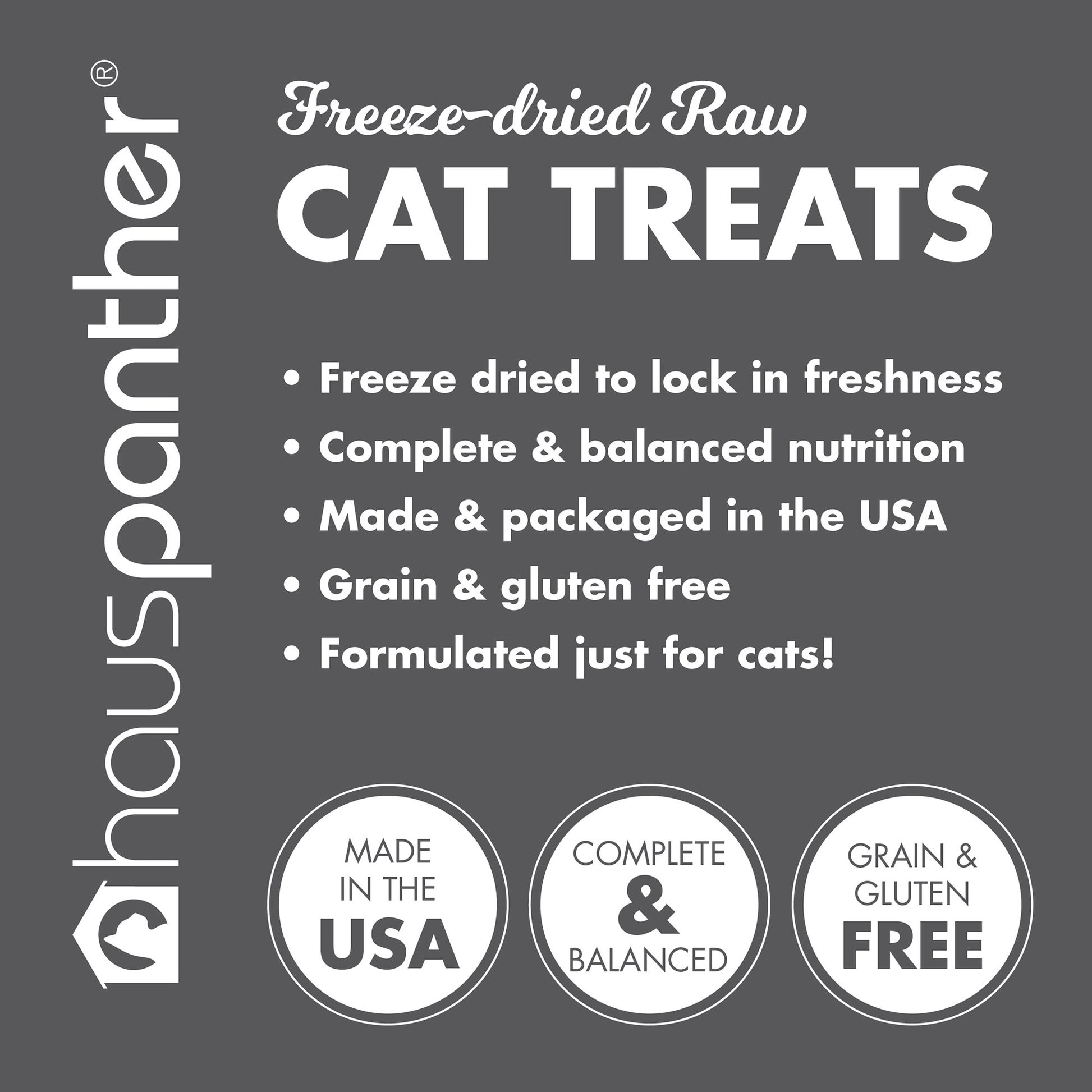 Hauspanther freeze-dried raw cat treats are complete & balanced bite-sized nuggets that cats love! The freeze drying process creates a top-quality treat that's convenient & delicious. Proudly made in the USA with US-sourced protein