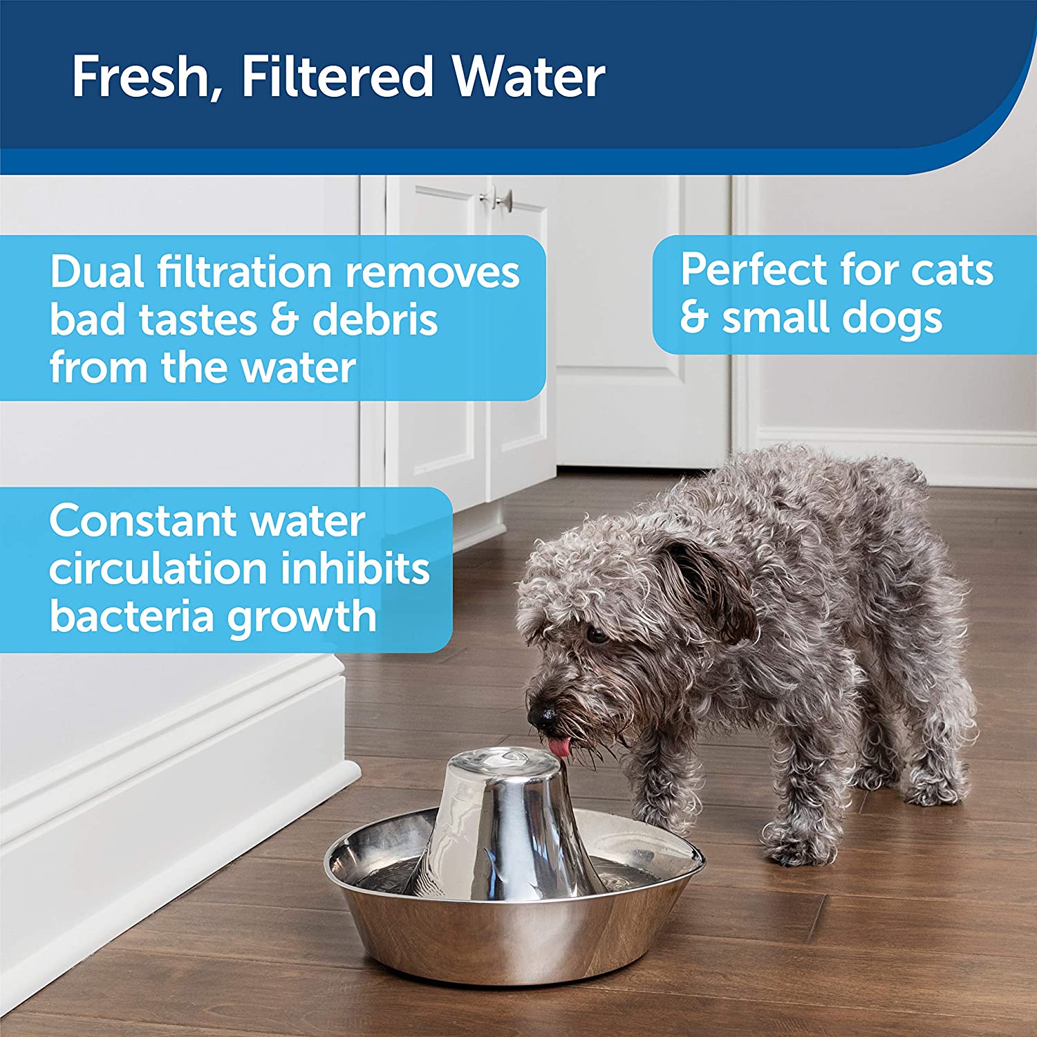 DUAL-FILTRATION: a carbon filter and foam filter removes pet hair, debris, bad tastes and odors, plus the constant water circulation helps prevent bacteria growth.